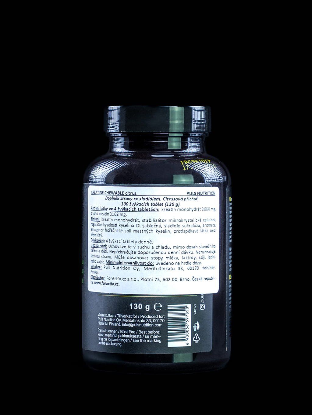 PULS NUTRITION Creatine Chewable představuje malou revoluci ve vaší sportovní výživě. Každá dávka (4 tablety) obsahuje 3 g čistého kreatin monohydrátu, který prokazatelně zvyšuje fyzickou výkonnost a pomáhá maximalizovat růst čisté svalové hmoty. Tyto lahodné veganské tablety bez cukru s příchutí lesního ovoce nebo citrusu můžete mít neustále u sebe – v posilovně, v práci i na cestách. Zvyšte svou tréninkovou kapacitu a posuňte své limity chytře, pohodlně a mimořádně chutně!