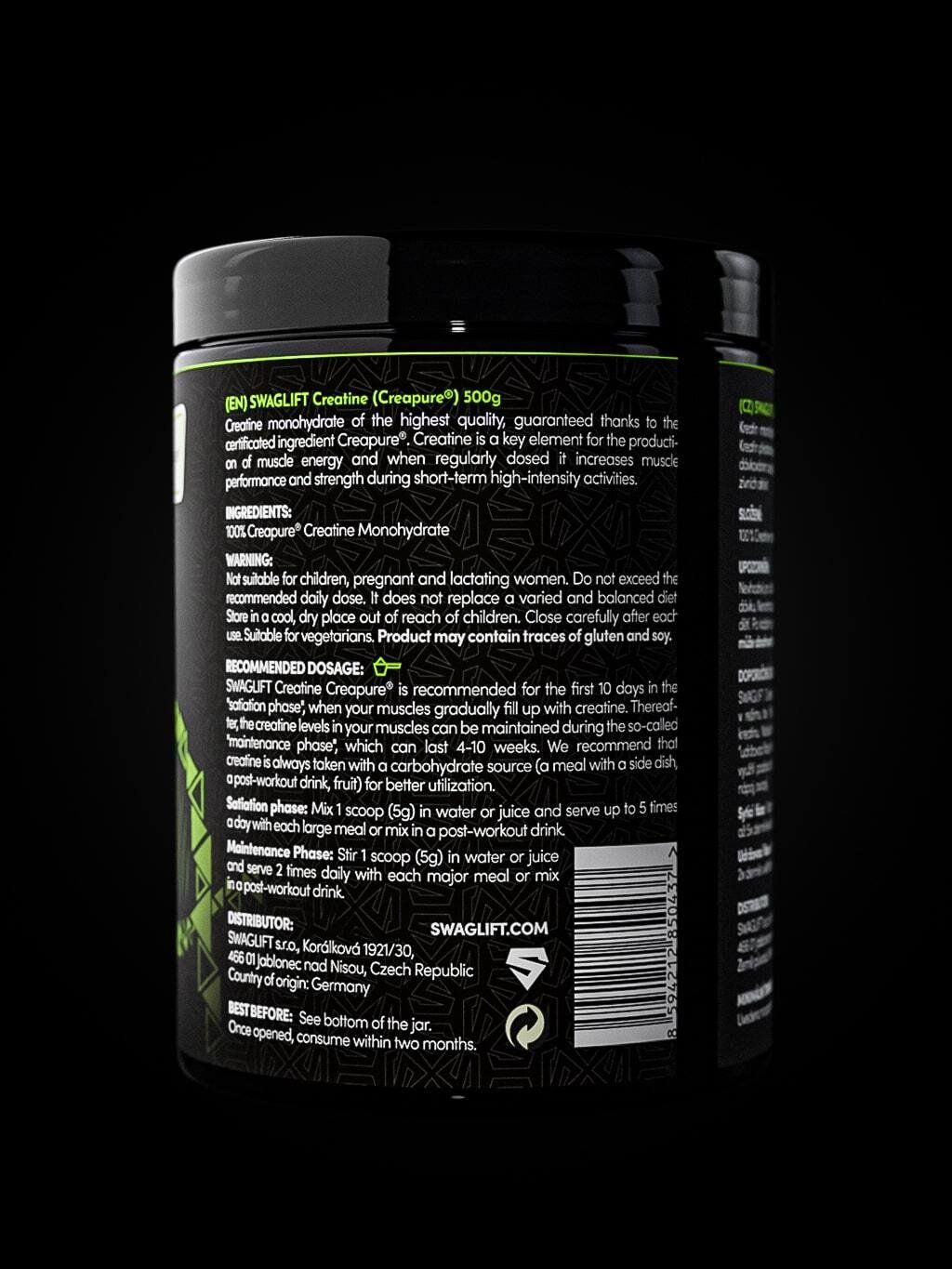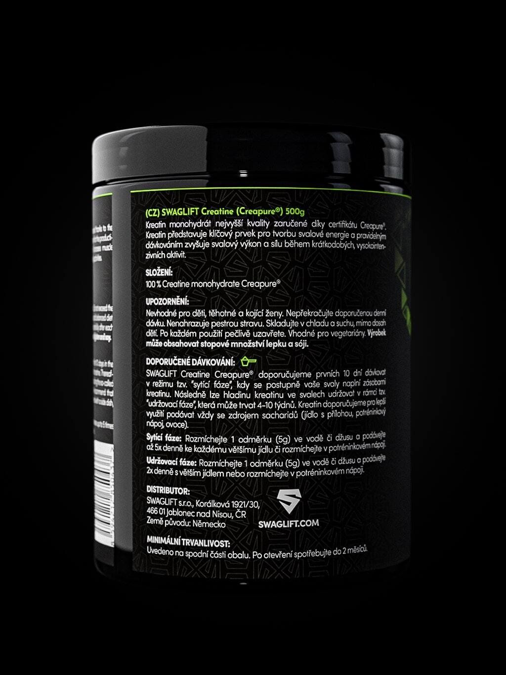 SWAGLIFT Creatine Creapure® (500 g) představuje 100% čistý kreatin monohydrát té nejvyšší dostupné kvalitě, kterou celosvětově zaručuje prestižní německý certifikát Creapure®. Kreatin je naprosto klíčový pro tvorbu svalové energie a jeho pravidelné dávkování prokazatelně zvyšuje svalový výkon a sílu během krátkodobých, vysoce intenzivních tréninků. Ať už zrovna začínáte tzv. sytící fázi nebo si hladinu jen udržujete, tato prémiová sportovní výživa posune vaše limity na novou úroveň!
