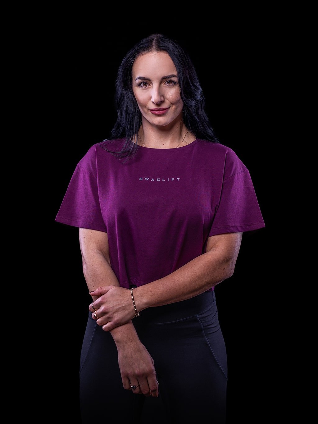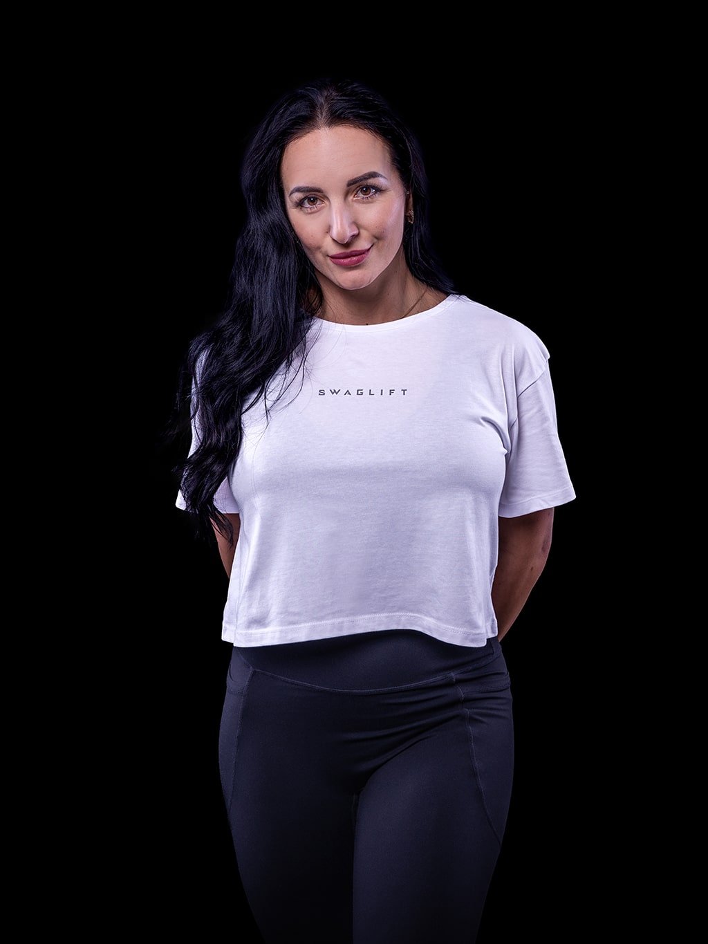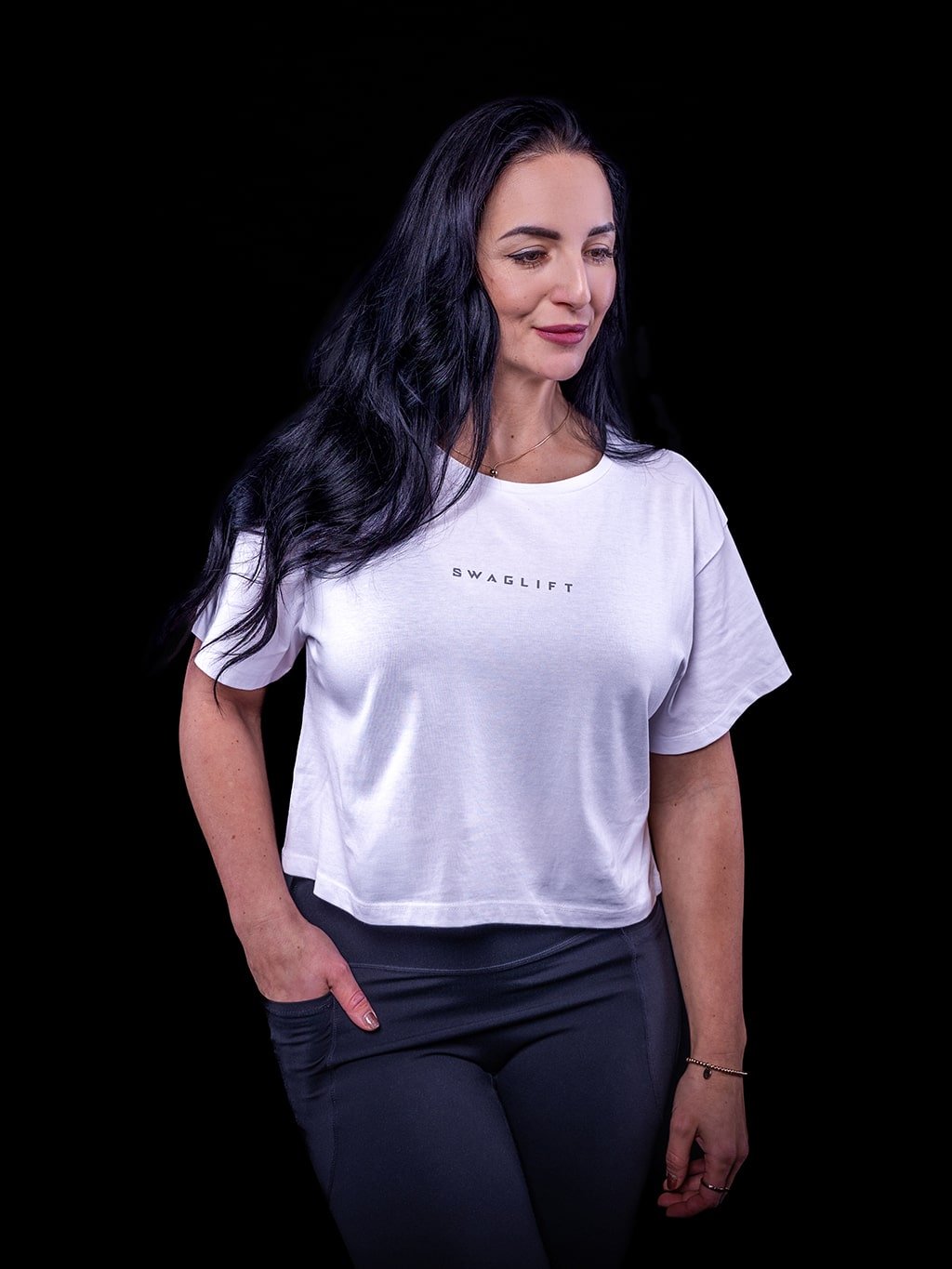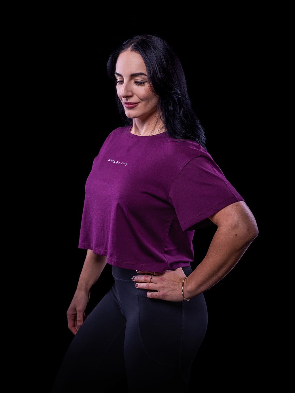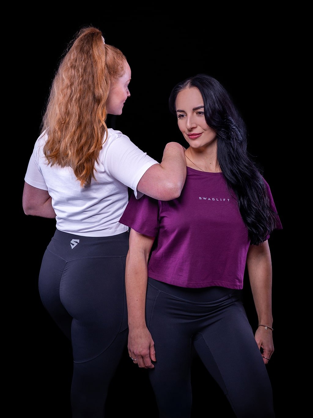 Dámské triko SWAGLIFT Power Crop Ti dodá sebevědomí na trénink i jen tak na obyčejné nošení. Krátký střih krásně zvýrazní pas, příjemný materiál sedne na tělo a nebrání v pohybu. Dostupné je ve dvou barevných variantách – bílá s minimalistickým tmavě šedým nápisem SWAGLIFT a burgundy se stejným světle šedým nápisem.