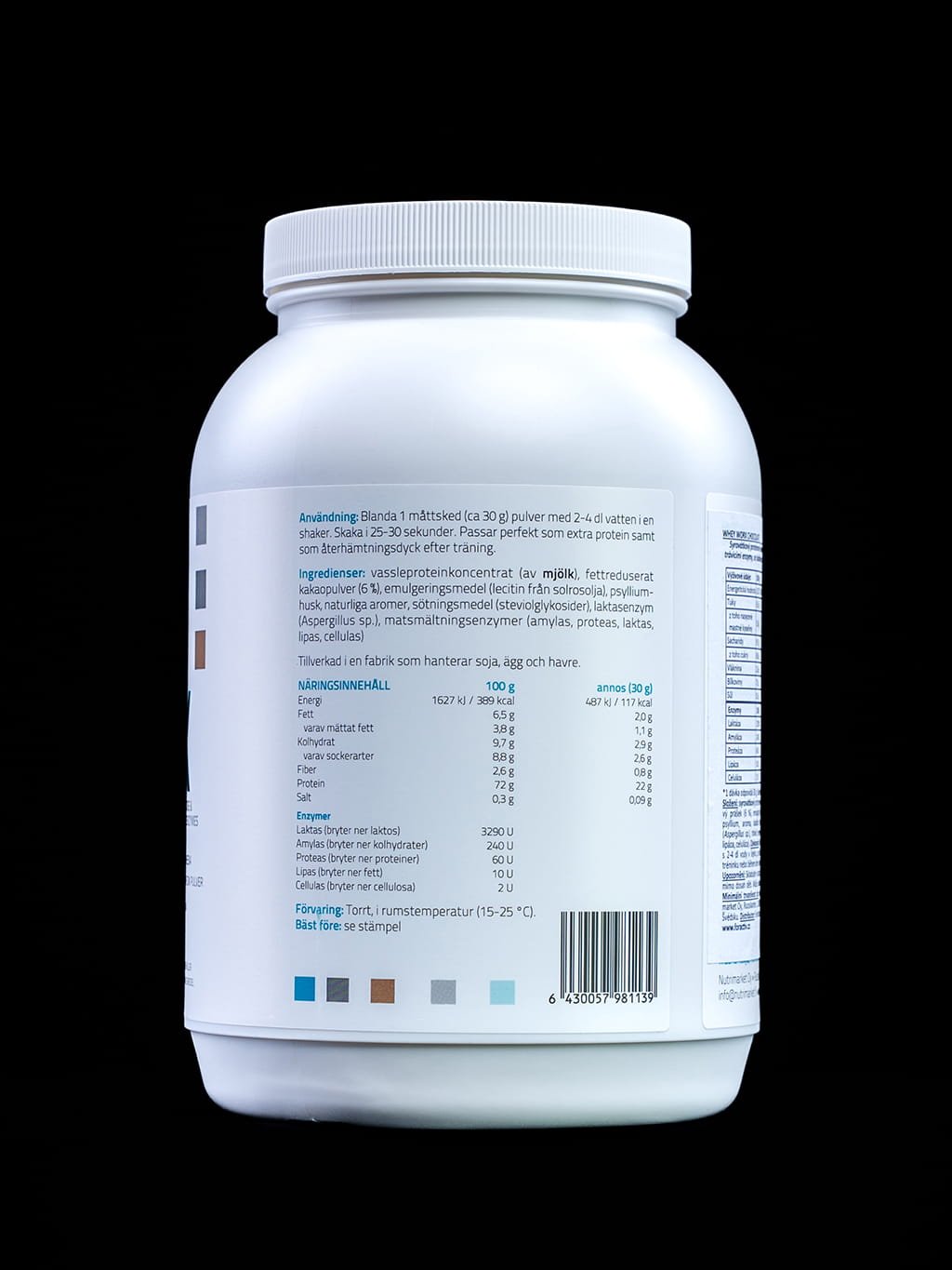 Syrovátkový proteinový koncentrát, nízkotučný kakaový prášek (6 %), emulgátor (slunečnicový lecitin), vláknina psyllium, aroma, sladidlo steviol-glykosidy, enzym laktáza (Aspergillus sp.), trávicí enzymy (amyláza, proteáza, laktáza, lipáza, celuláza).