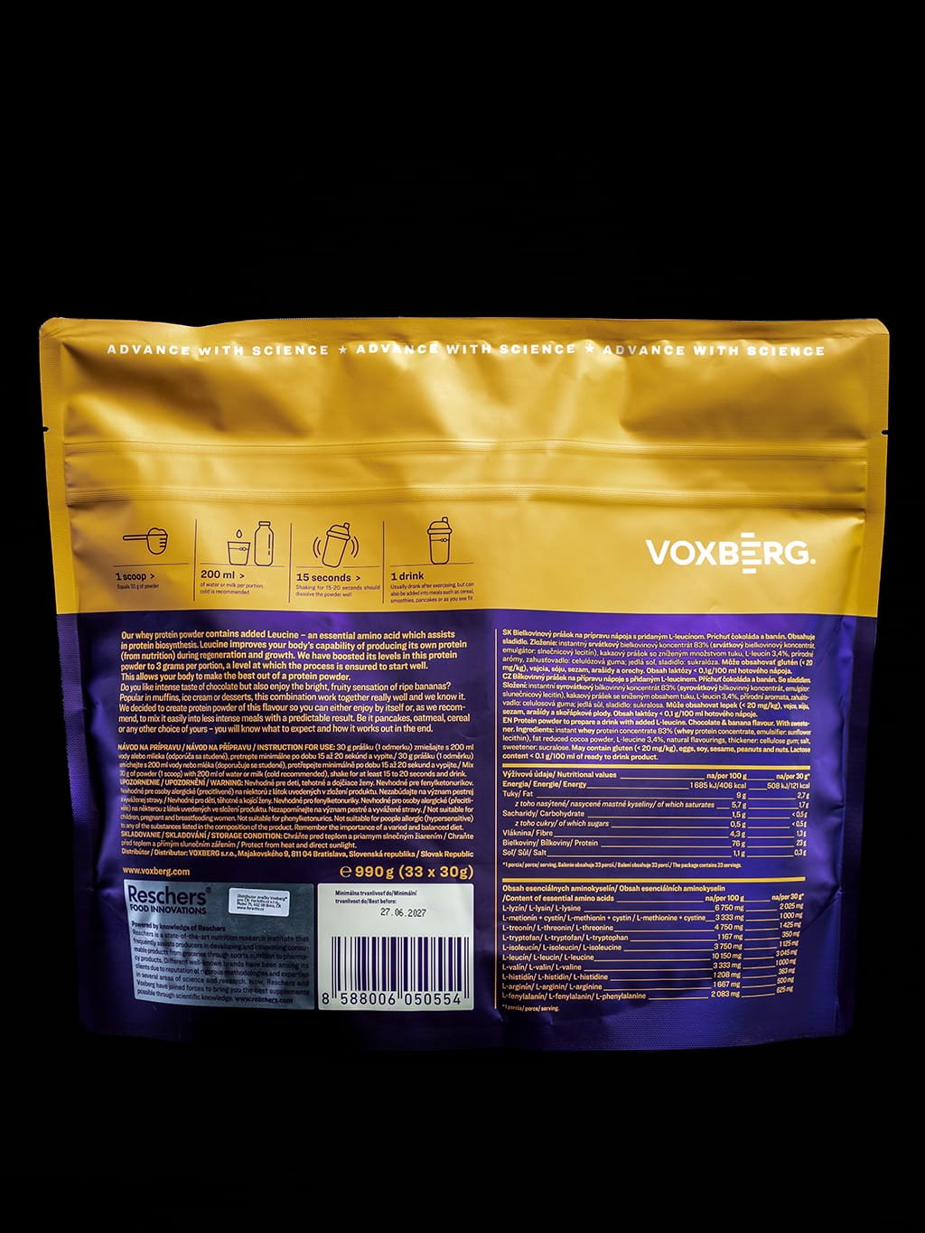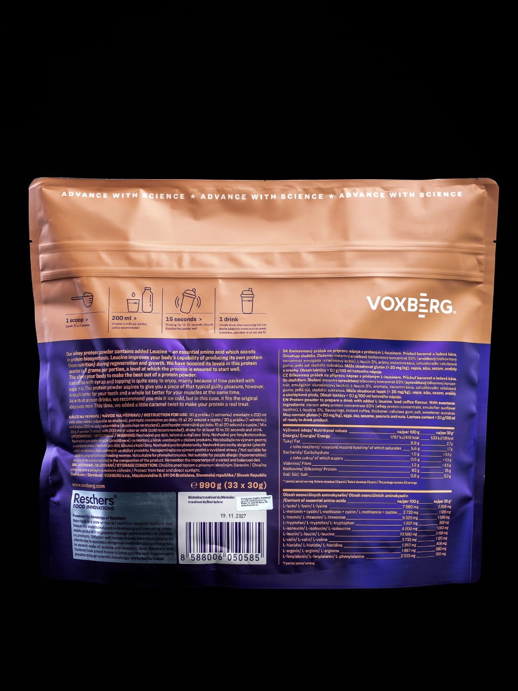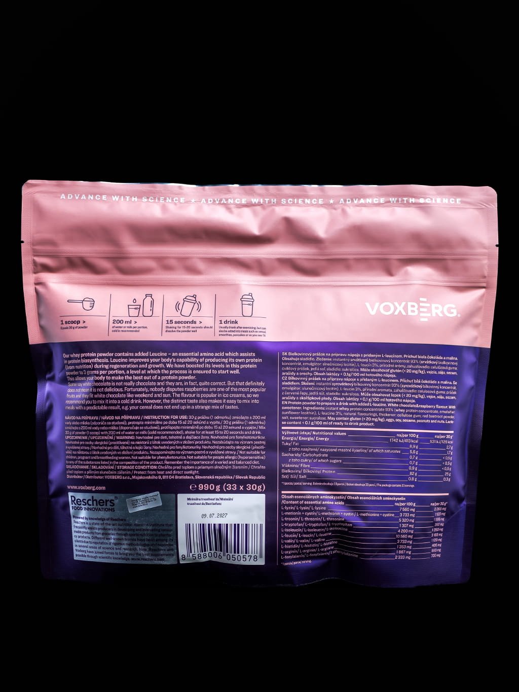 Tento protein je navržen pro maximální stravitelnost i požitek; je zcela bez laktózy, bez lepku a s minimálním obsahem cukru (pod 0,3 g na porci), takže skvěle zapadne i do nízkosacharidové diety. Při vývoji byl kladen důraz na dokonalou rozpustnost bez hrudek. Za kvalitou produktu stojí prémiová slovenská značka Voxberg, která jako přímý výrobce s certifikací IFS a ve spolupráci s Reschers Food Innovations aplikuje nejnovější vědecké poznatky do každého kroku kontrolované výroby.