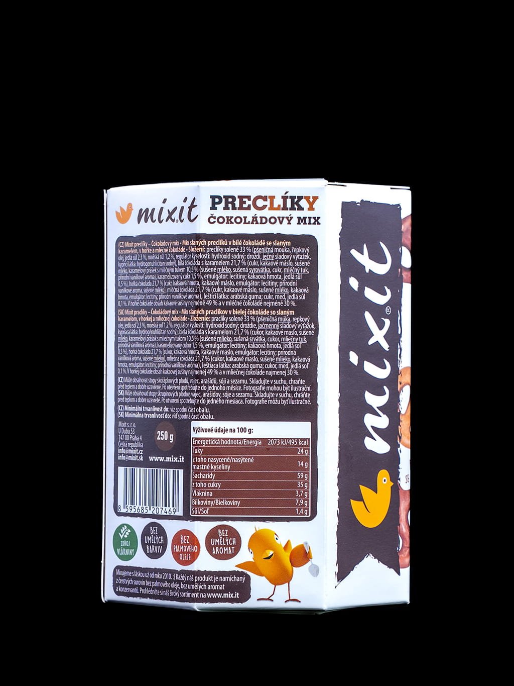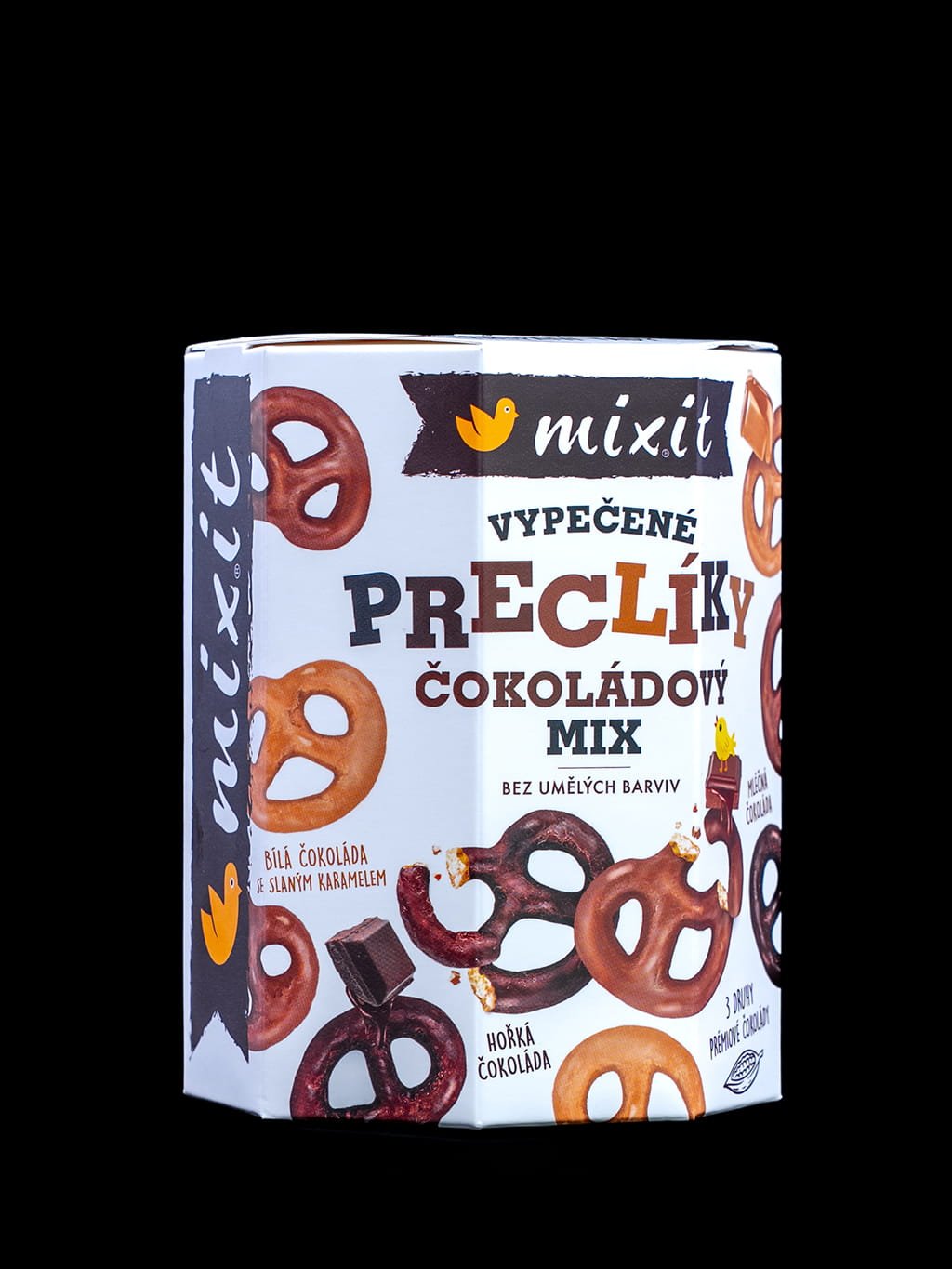 Mix slaných preclíků v bílé čokoládě se slaným karamelem, v hořké a mléčné čokoládě