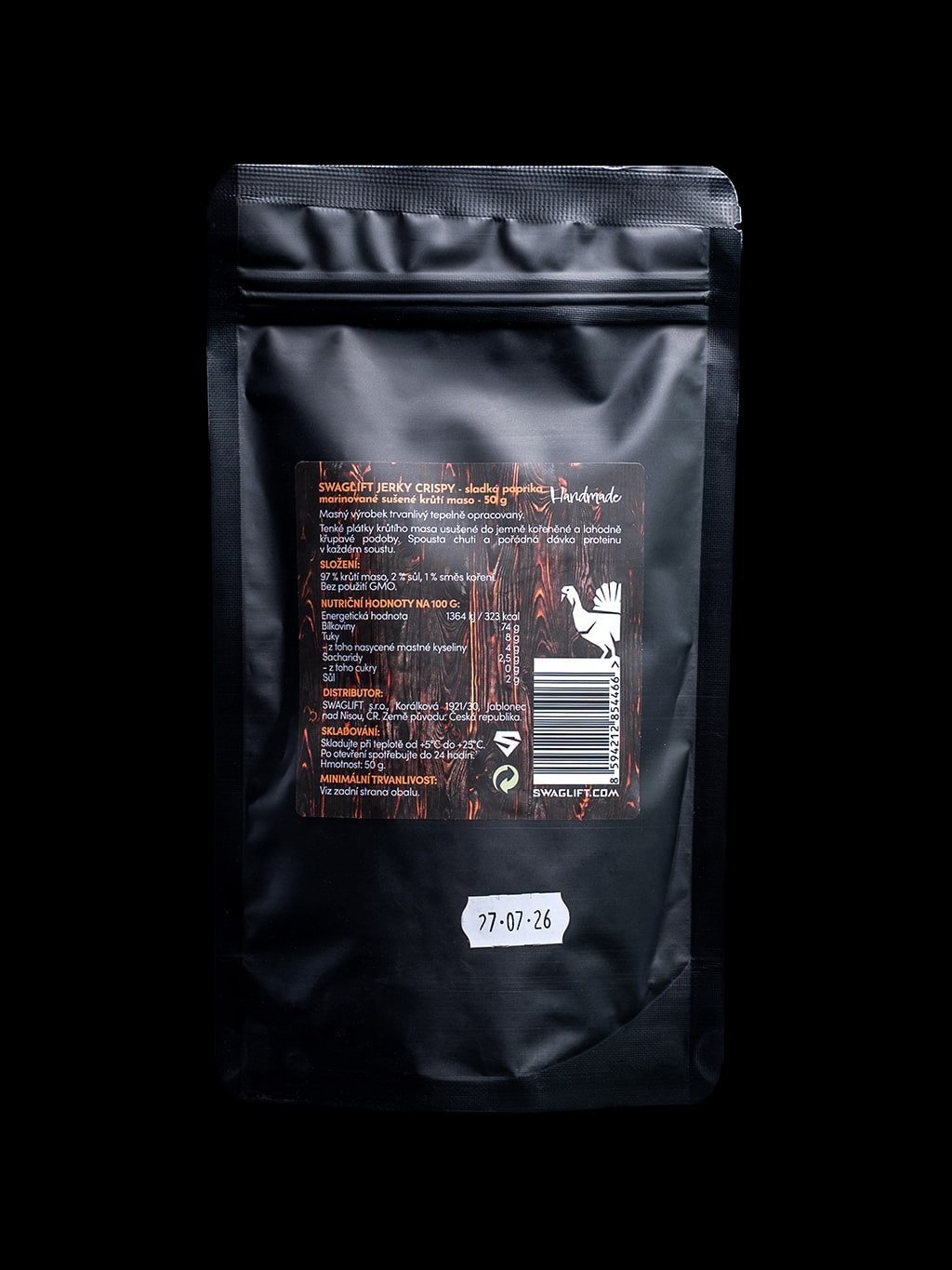 Sušené krůtí maso SWAGLIFT Jerky Crispy Handmade Chipsy s příchutí sladké papriky jsou lehké, křupavé a dokonale kořeněné plátky – ideální zdroj energie a bílkovin na cesty, do práce i po sportu.