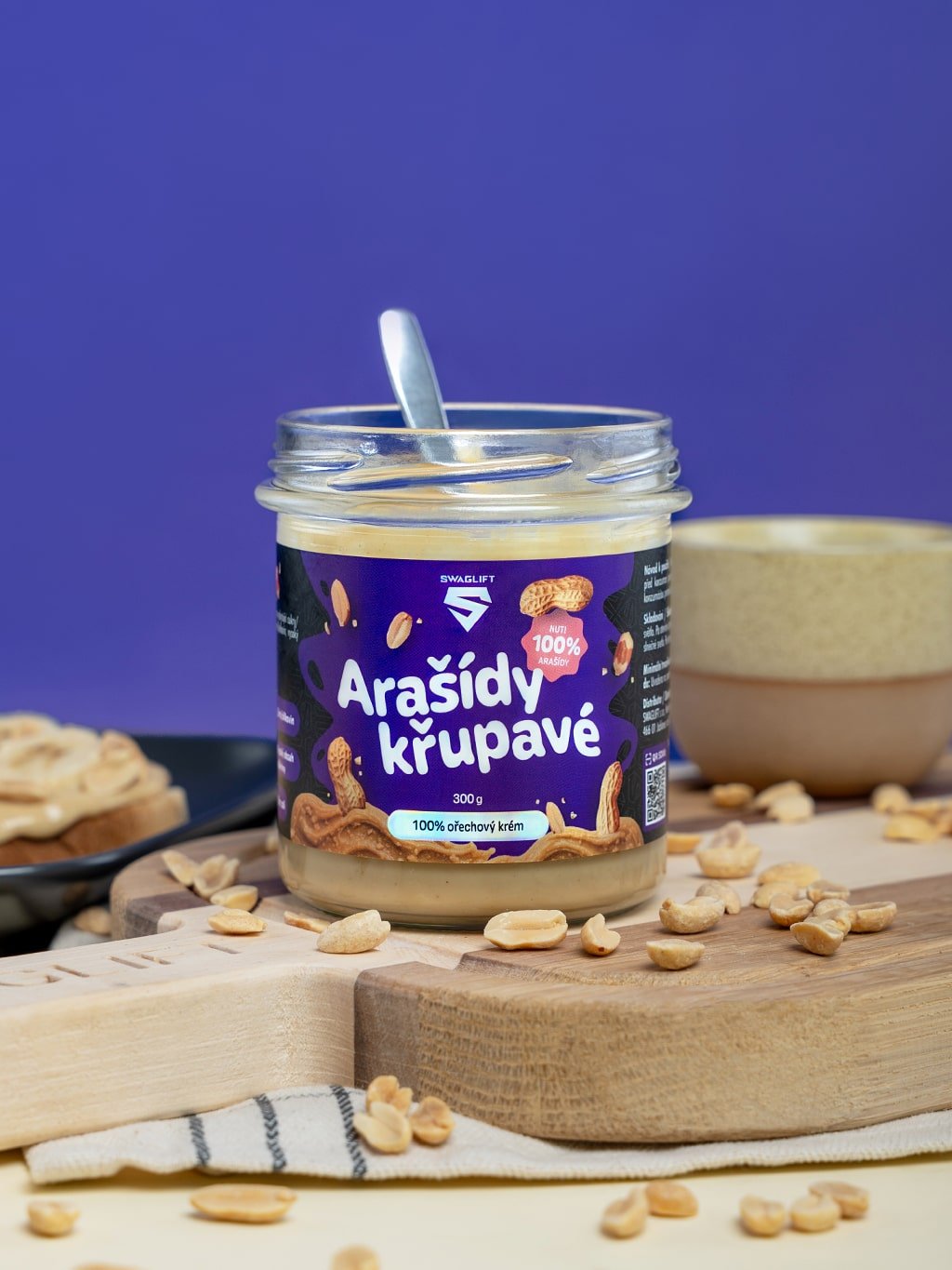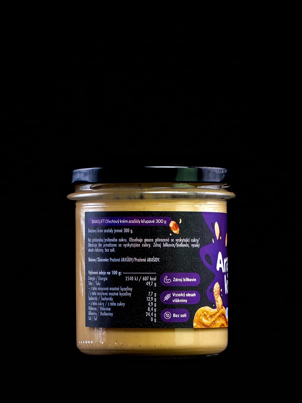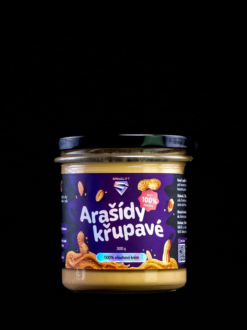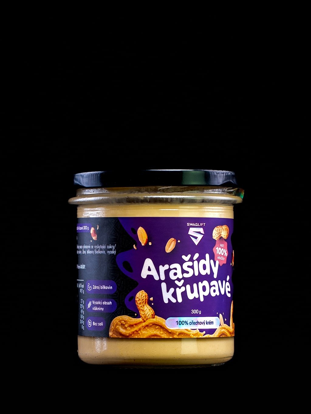 SWAGLIFT Arašídy křupavé – poctivý arašídový krém vyrobený ze 100 % pražených arašídů, bez zbytečných přísad. Oproti jemné variantě nabízí lahodně křupavou strukturu, která dodá každé lžičce i receptu nový rozměr.