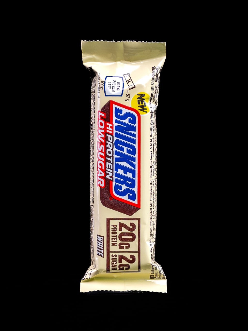 Proteinová tyčinka, která připomíná klasickou Snickers, ale je vylepšená o pořádnou dávku bílkovin a výrazně méně cukru. Uvnitř najdete arašídy a karamelovou vrstvu, celé je pak zalité jemnou bílou čokoládou. V každé tyčince je 20 g proteinu a jen 2 g cukru – ideální jako rychlá svačina nebo po tréninku.