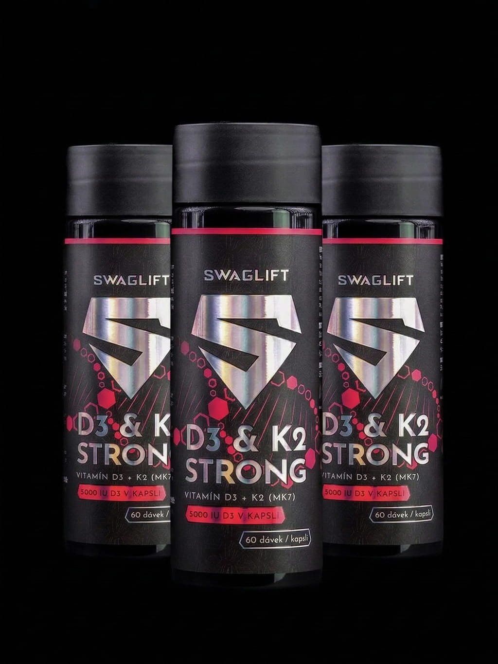 Výhodný balíček - 3x SWAGLIFT D3 & K2 STRONG 60 kapslí - prémiový vitamín D3 z lišejníku (5000 IU v kapsli) a značkový vitamín K2 (MenaQ7®) ve formě MK-7. ro perfektní vstřebatelnost je složení obohaceno o MCT olej z kokosu. Díky rostlinné kapsli je produkt 100% vegan.