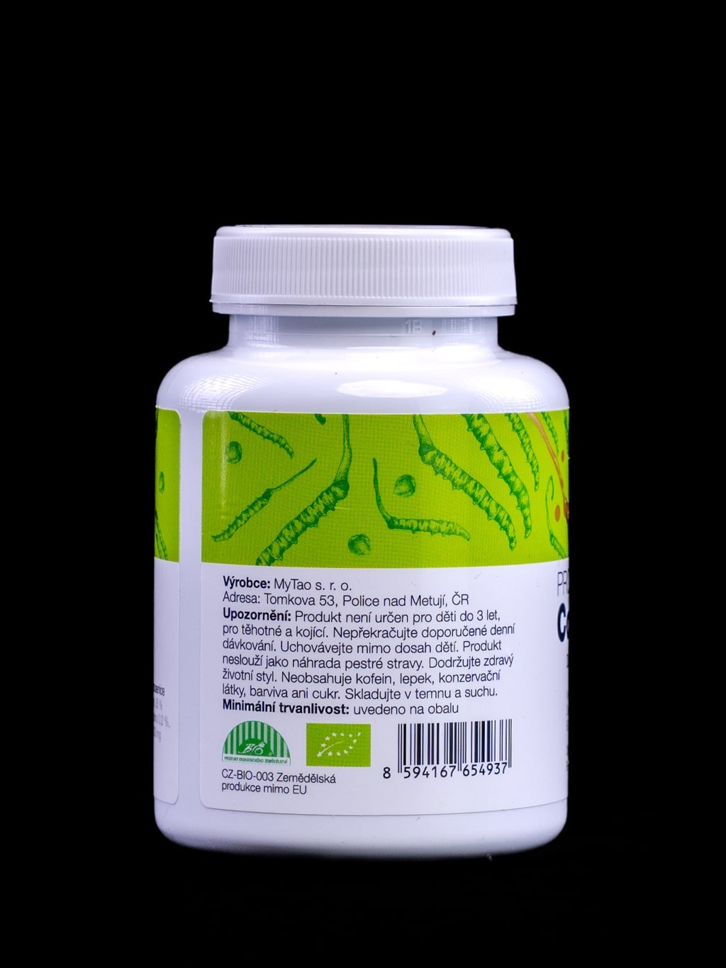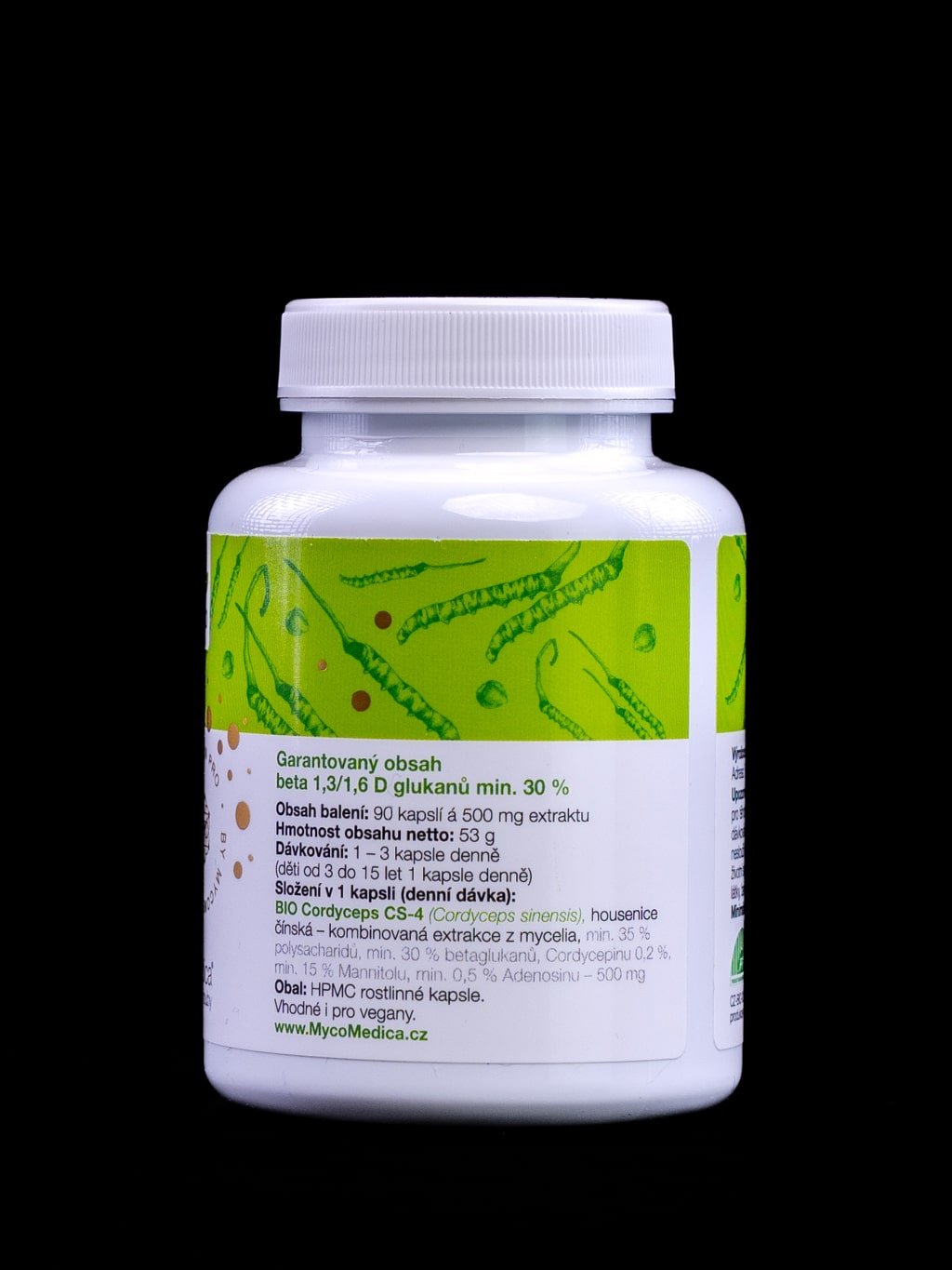 BIO Cordyceps (housenice čínská, Cordyceps sinensis) – kombinovaná extrakce z mycelia min. 30 % betaglukanů, Cordycepinu 0,2 %, min. 15 % Mannitolu, min. 0,5 % Adenosinu – 500 mg (100% čistý extrakt)