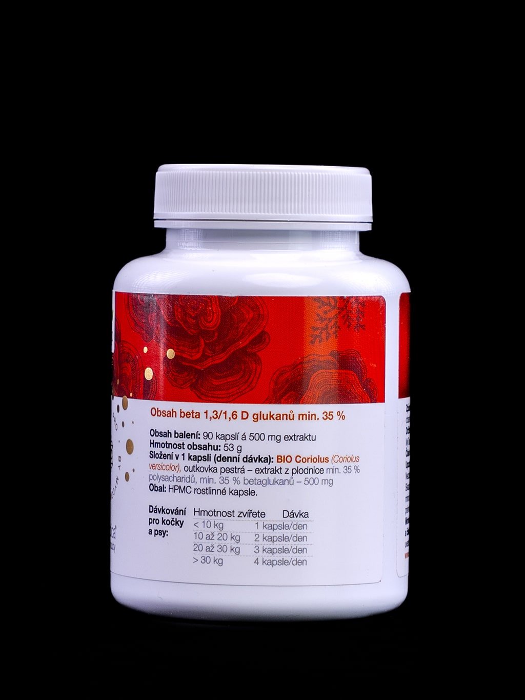 BIO Coriolus (outkovka pestrá, Coriolus versicolor) – kombinovaná extrakce z plodnice min. 35 % betaglukanů – 500 mg (100% čistý extrakt).