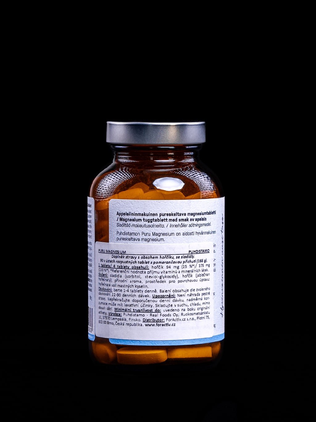 Rozpustné tablety v ústech jsou praktickým způsobem, jak doplnit hořčík. Díky této formě se látka začne vstřebávat už v ústech a rychle se dostává dále do těla. Puru Magnesium obsahuje hořečnatý malát, což je organická forma, ve které je hořčík vázán na kyselinu jablečnou pomocí chelátové vazby. Kyselina jablečná hraje roli v tzv. Krebsově cyklu, který je spojený s přeměnou živin na energii. Během tohoto procesu se kyselina jablečná mění na pyruvát, jenž přispívá k energetickým potřebám svalů. Malát hořečnatý v této praktické formě je vhodný k užívání kdykoliv během dne, a to zejména ve chvílích, kdy hledáme alternativu k běžným povzbuzením, jako je kofein. Hořčík je známý svým významem pro celkovou vitalitu, správné fungování svalů a podporu psychické pohody.