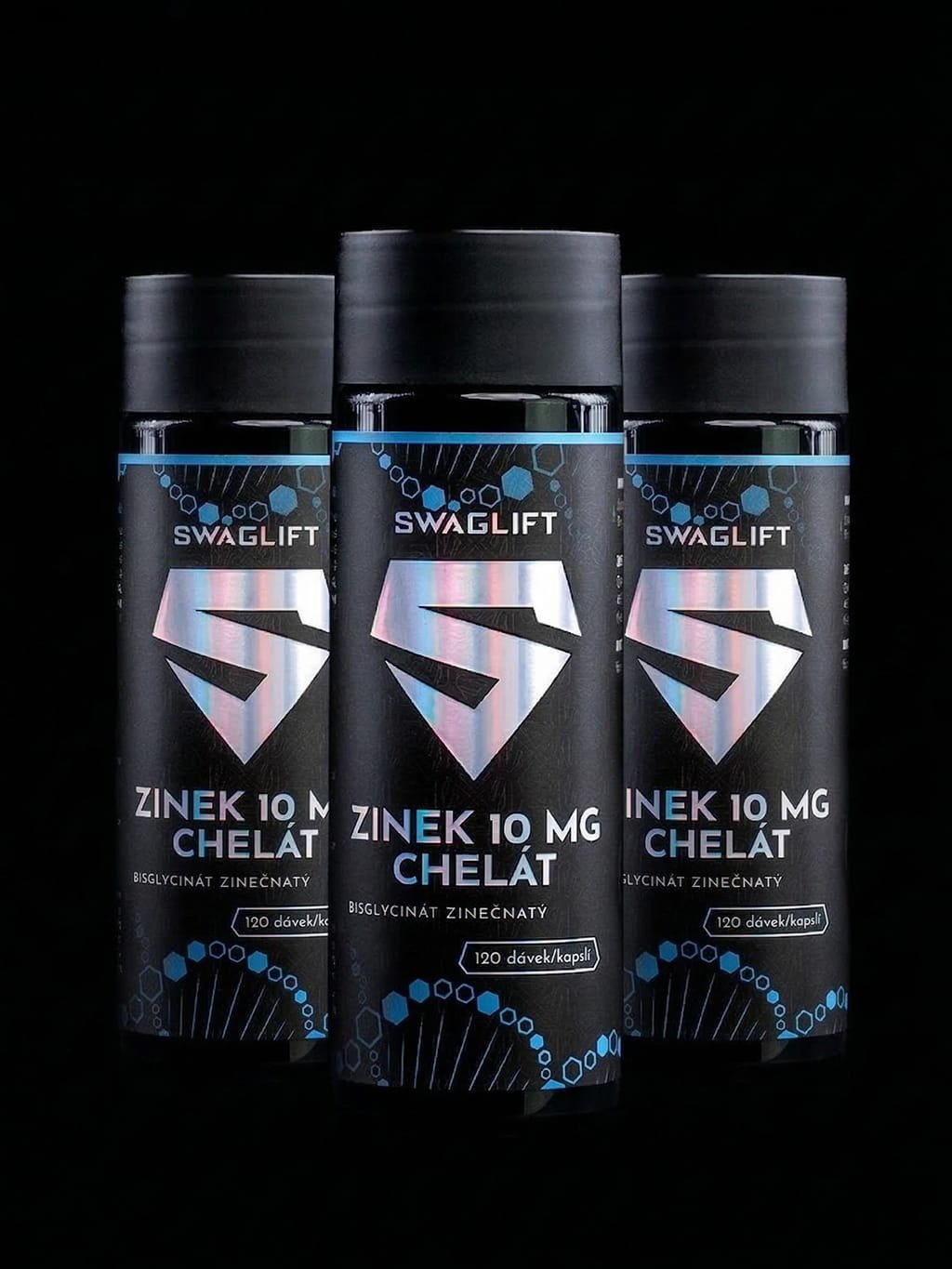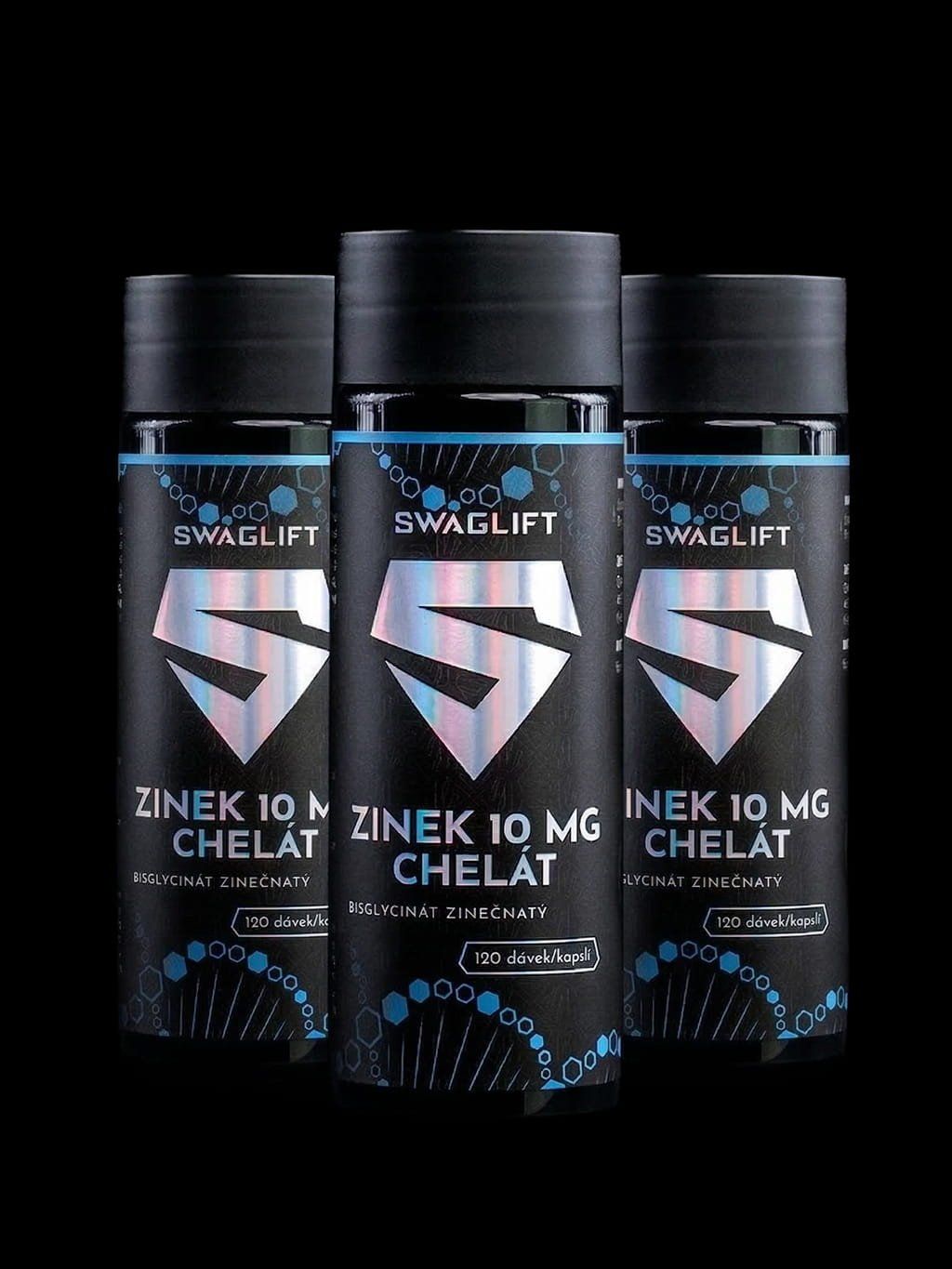 Výhodný balíček - 3x SWAGLIFT Zinek Chelát 10 mg - bisglycinát zinečnatý 120 kapslí - kvalitní doplněk stravy obsahující zinek v dobře vstřebatelné chelátové formě (bisglycinát zinečnatý). Každá kapsle dodá vašemu tělu 100 % denní referenční hodnoty příjmu zinku. Díky svému složení a rostlinné kapsli je produkt vhodný i pro vegany.